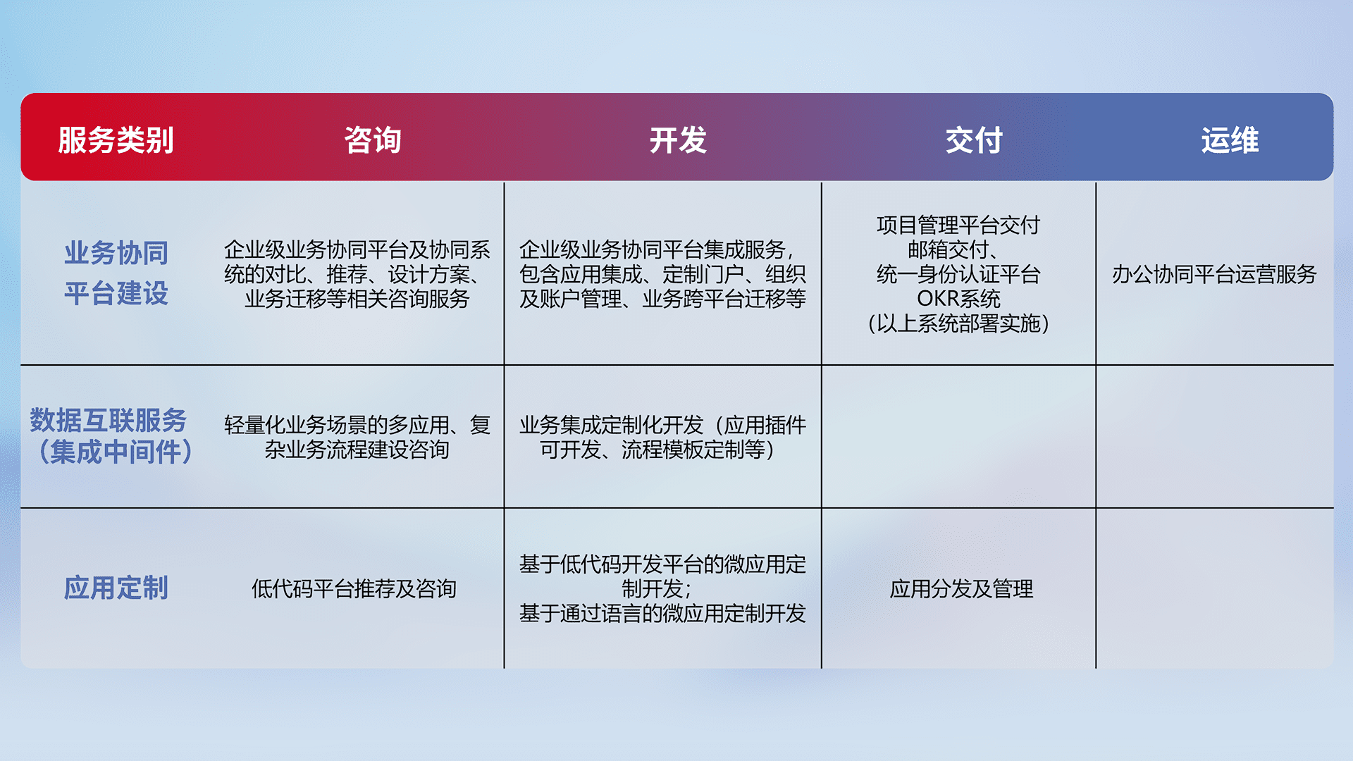 针对钉钉、、、、企微、、、IDaas等平台级产品提供产品的规划、、、、方案、、、交付、、、定制化开发等服务,,,,实现如统一协同办公、、智能客户服务、、、混合会议管理、、智能数据查询、、、等业务场景,,,,实现数字化转型。。