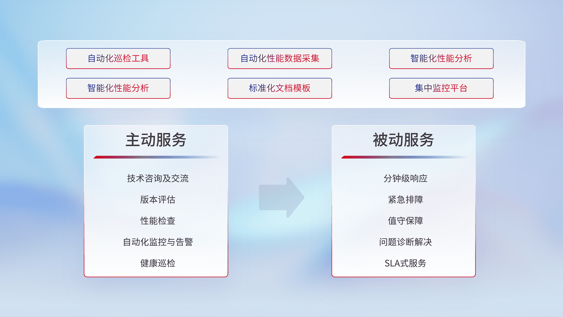 智能化工具和标准化文档,,,,保障服务质量,,,提供主动服务(包含技术咨询、、、、版本评估、、、、性能检查、、、自动化监控与告警、、、、健康巡检)和被动服务包含(分钟级响应、、紧急排障、、、、值守保障、、、、问题诊断解决、、、SLA服务)。。。。